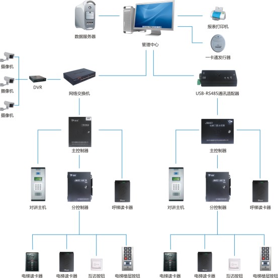 ◆ 采用主控器+分控器的二級(jí)結(jié)構(gòu),主控器固定安裝于電梯機(jī)房,負(fù)責(zé)所有的邏輯處理,分控器安裝于電梯轎廂頂,主要負(fù)責(zé)樓層按 鍵控制及讀卡器卡號(hào)信息采集,施工更簡(jiǎn)單,維護(hù)更方便;